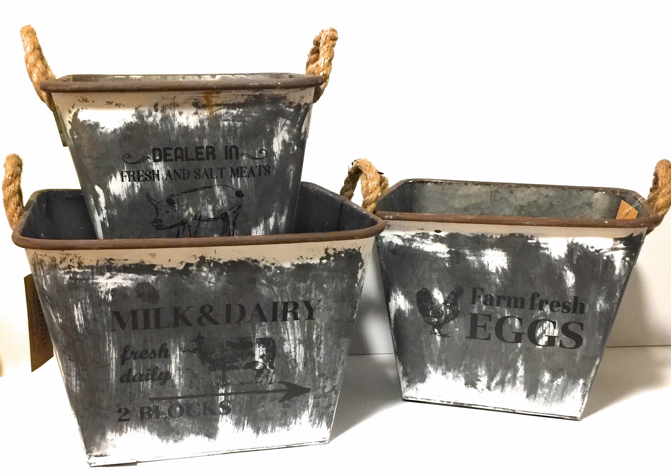 These adorable farmhouse galvanized metal containers are great for storage and will add a country feel to your kitchen or pantry. The unique distressing and rope jute handles give this set a unique flair.