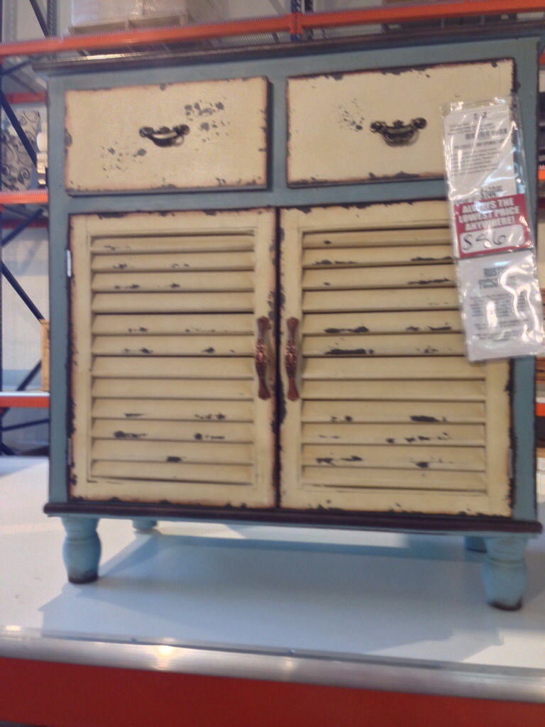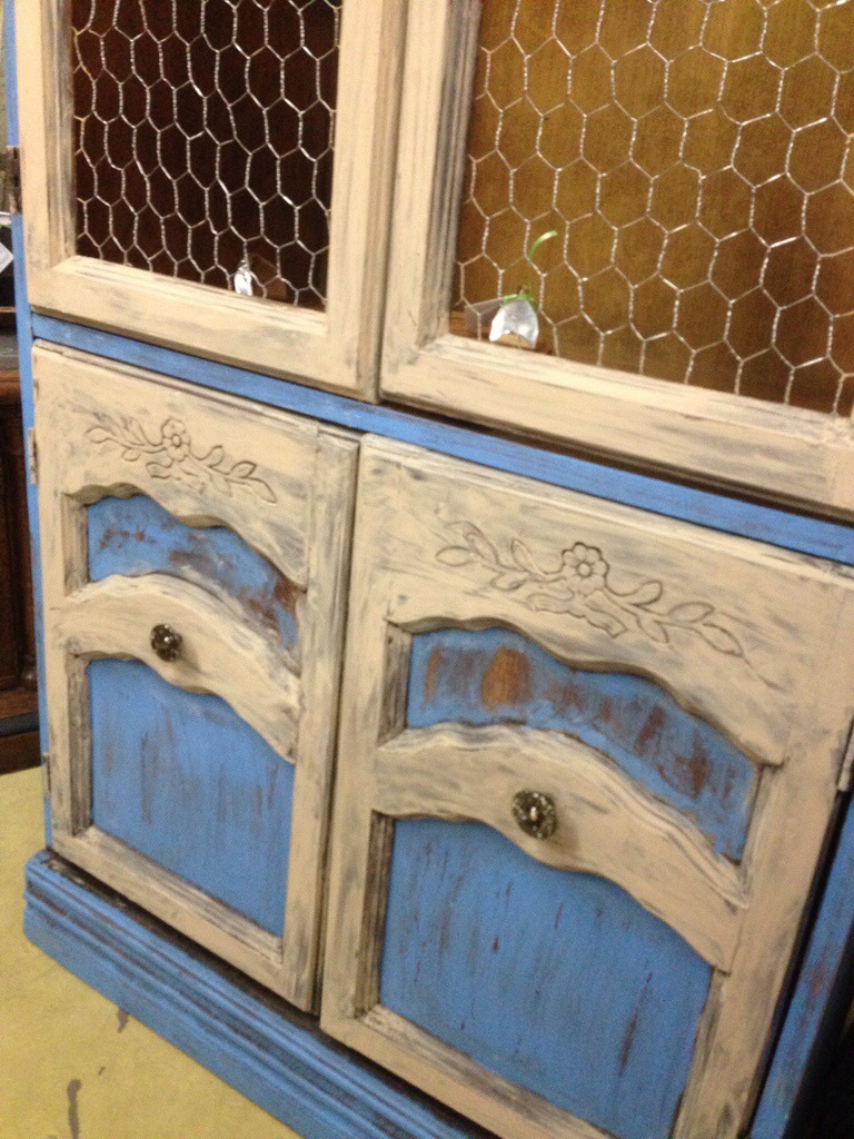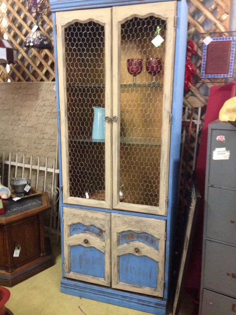 I found a cabinet with great bones at a thrift shop and my mind went wild with different ideas of transformation. I bought it for $29.99, took it home and because I had so many different colors and finishes in mind I had to let it wait ( for two months ) until I filtered through my thoughts. Then I saw a cute small cabinet at a local furniture store and then I knew. Blue with country white doors and chicken wire. I wish I had a before picture of the holes where the knobs were missing but I was so excited I forgot to do it. Here’s a look at my inspiration and the final product.