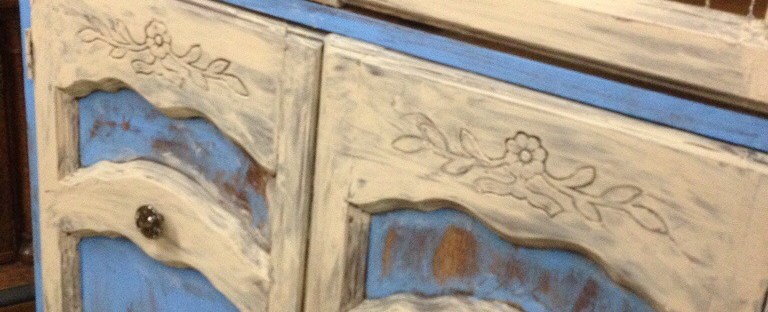 I found a cabinet with great bones at a thrift shop and my mind went wild with different ideas of transformation. I bought it for $29.99, took it home and because I had so many different colors and finishes in mind I had to let it wait ( for two months ) until I filtered through my thoughts. Then I saw a cute small cabinet at a local furniture store and then I knew. Blue with country white doors and chicken wire. I wish I had a before picture of the holes where the knobs were missing but I was so excited I forgot to do it. Here’s a look at my inspiration and the final product.