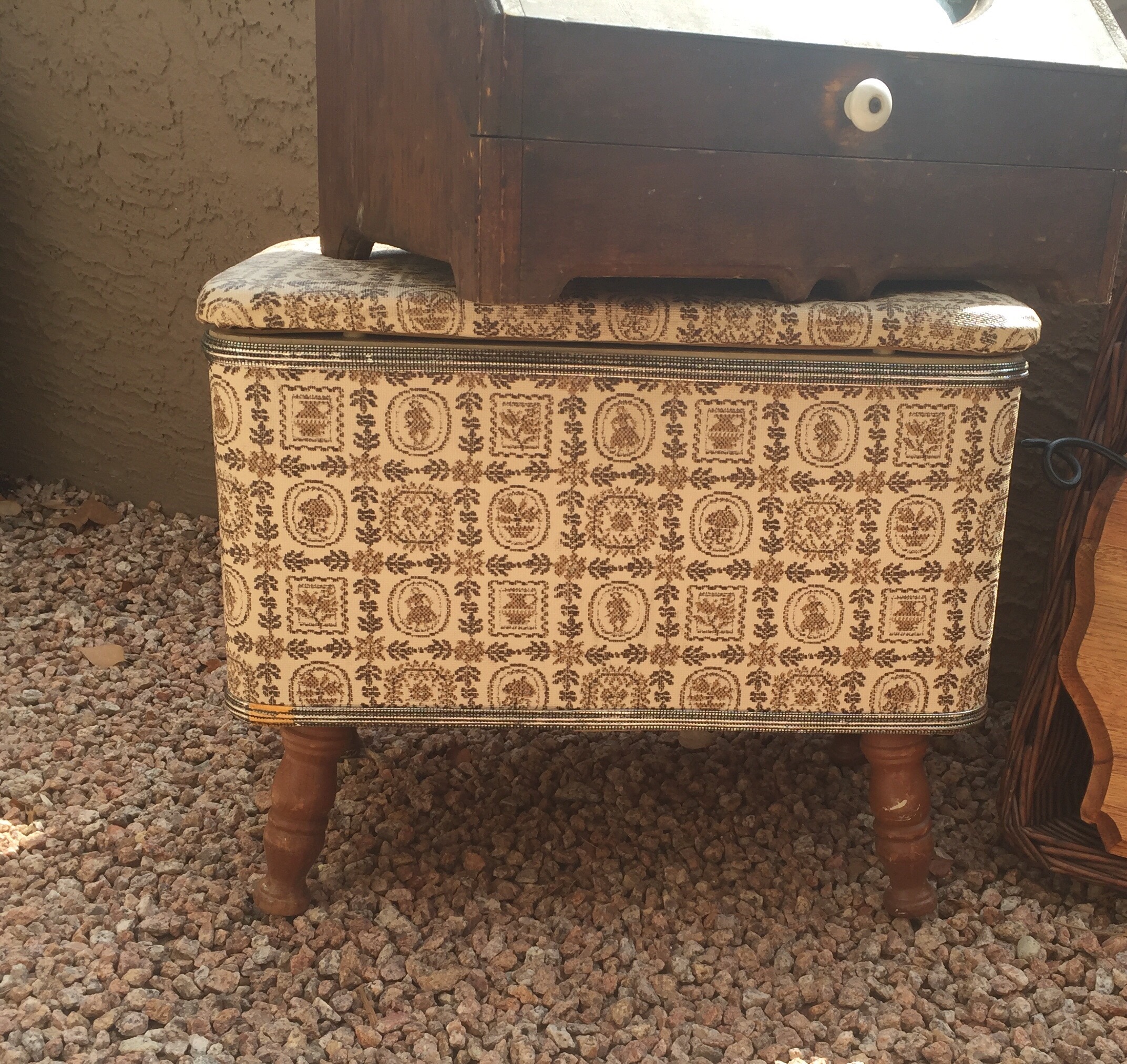 I fell in love with this vintage sewing box box at a thrift shop. The beautiful vinyl cover has pictures of men and women that appear to be dancing. It has a faux embroidered appearance and four turned wooden legs.